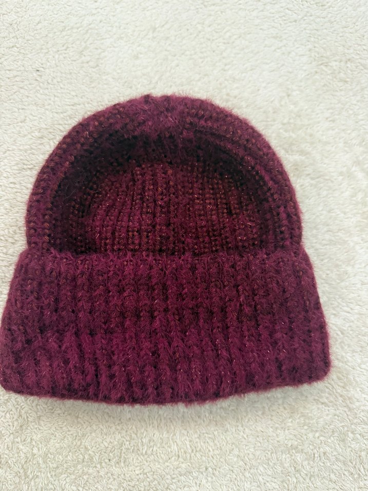 Kadınlar için yumuşak iplikle örülmüş, konforlu ve sade bordo renkli yün örgü bere.