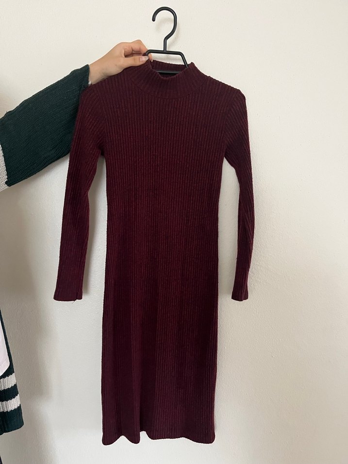 Bordo renkte, yumuşak yün örme kumaştan, yüksek yakalı ve uzun kollu, vücuda oturan midi elbise.