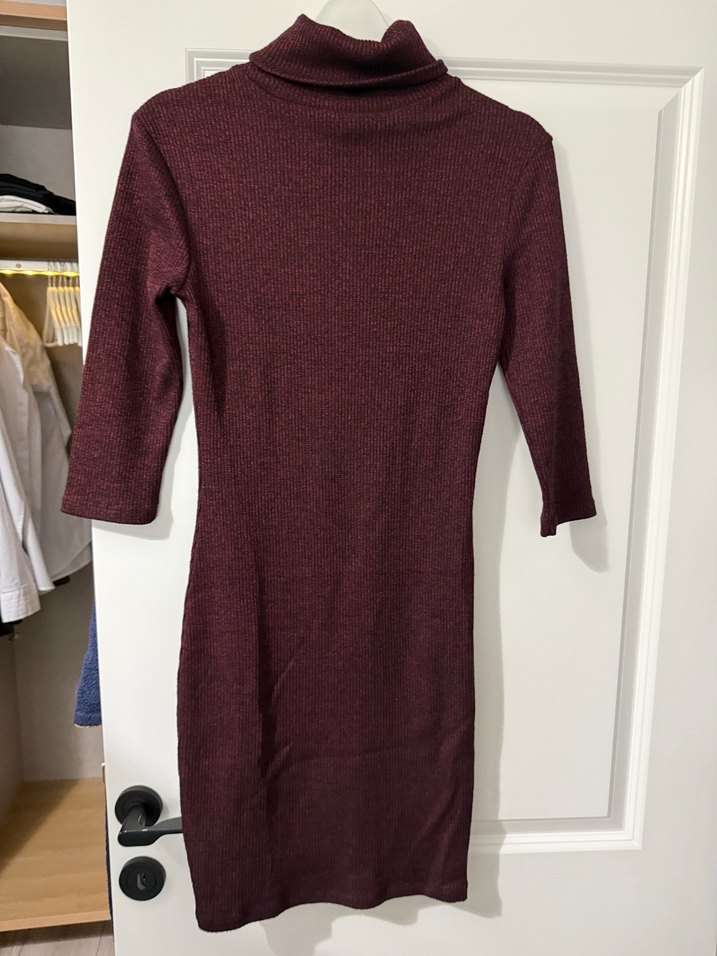Bordo renk, yün triko kumaştan, yarım balıkçı yaka ve uzun kollu, vücuda oturan midi boy elbise. Rahat ve modern bir görünüm sunar. Kışlık mini elbise çizmelerle harika oluyor rengi koyu bordo 2.fotodaki gibi kolları yetim kol hafif boğazlı kotondan aldım 36beden defo yok