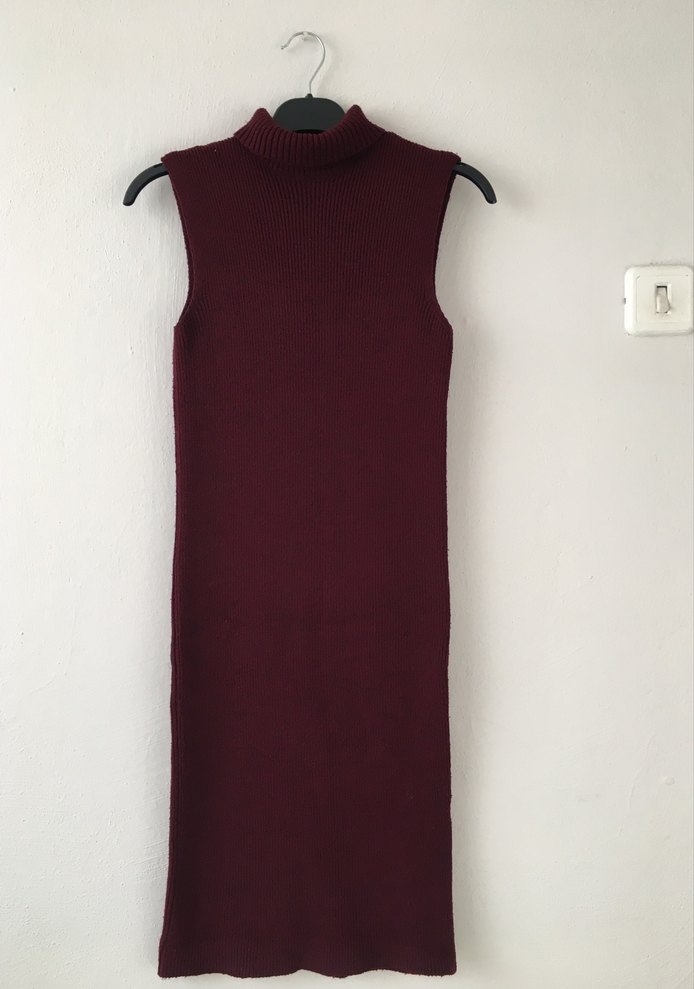 Bordo renkli, yünlü, yüksek yakalı ve kolsuz, vücuda oturan midi uzunlukta triko elbisedir.