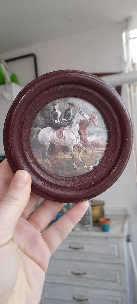Klasik biniciler resimli, bordo rengi yuvarlak ahşap çerçeveli tablo. Vintage görünümde, pürüzsüz yüzeye sahip. ️