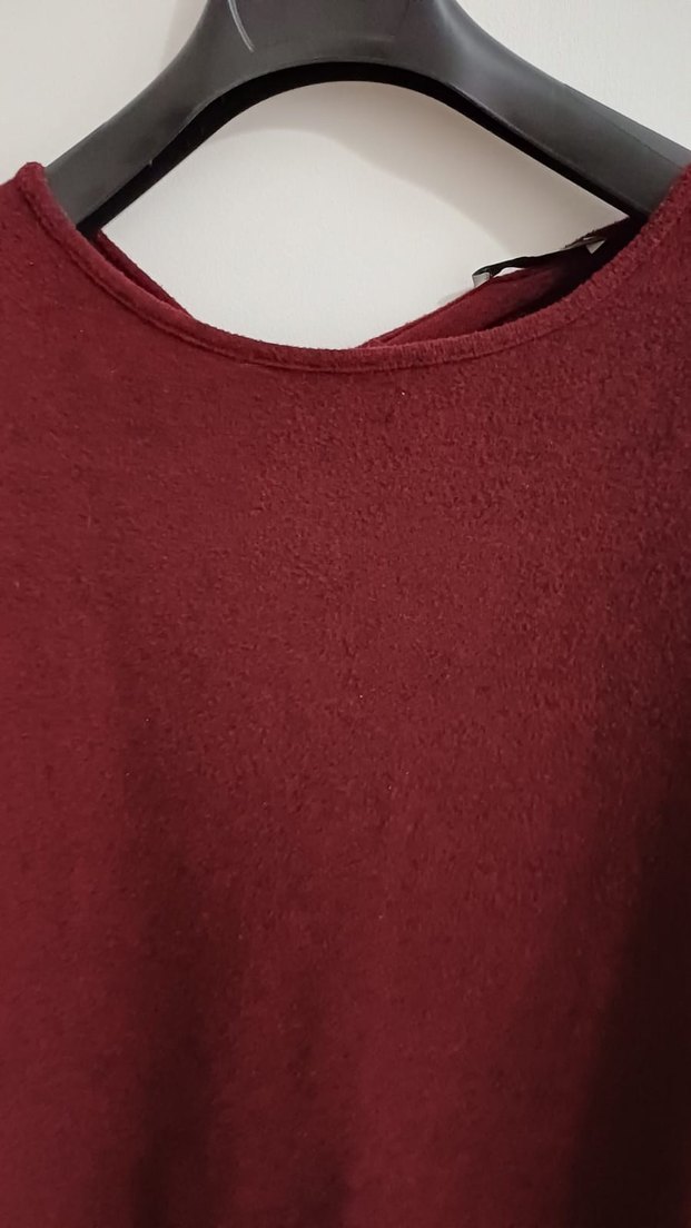 Bordo renk yuvarlak yakalı, uzun kollu, yumuşak ve sıcak kumaştan yapılmış bol kesim kadın bluz. Düz ve desensiz tasarımı günlük kullanıma uygundur.