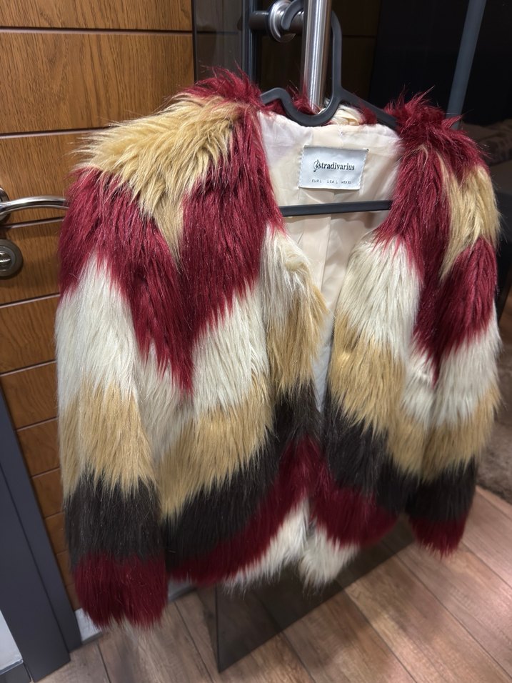 Bordo zebra desenli suni kürk cekette tüy detayları, kesik yaka, uzun kol ve bol midi kesim bulunur. Günlük kullanım için uygundur.