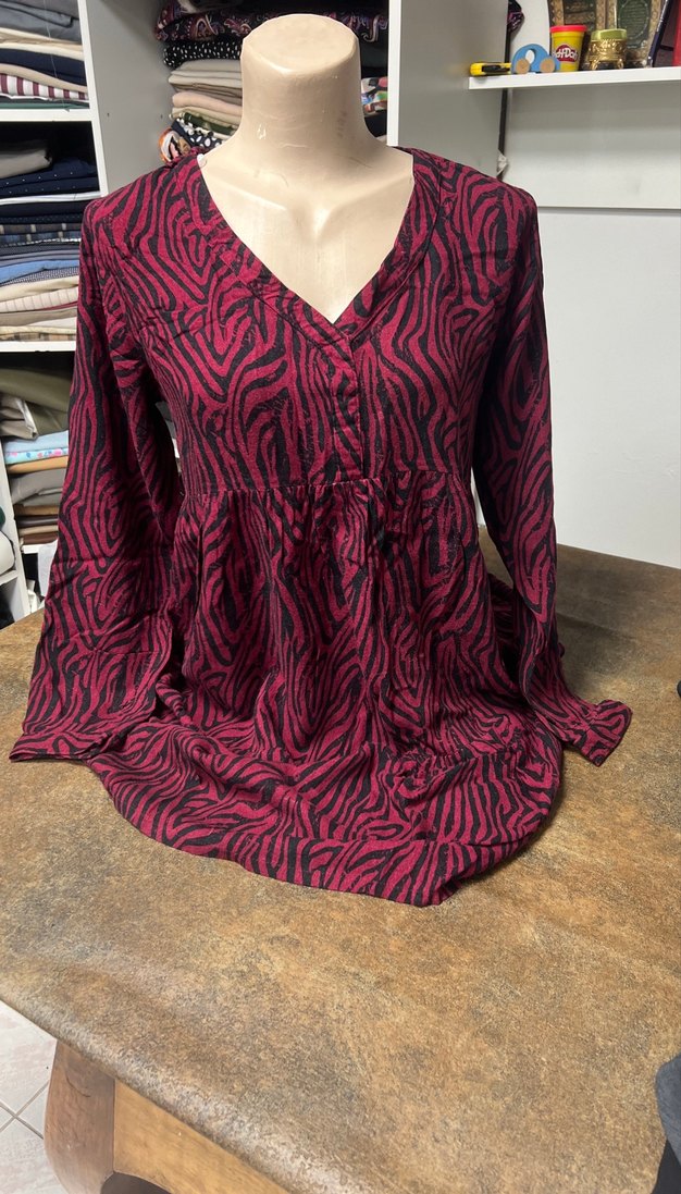 Bordo zebra desenli hamile tunik, uzun kollu ve V yakalıdır. Düğmeli, bol kesim ve yumuşak dokulu kumaştan üretilmiştir.