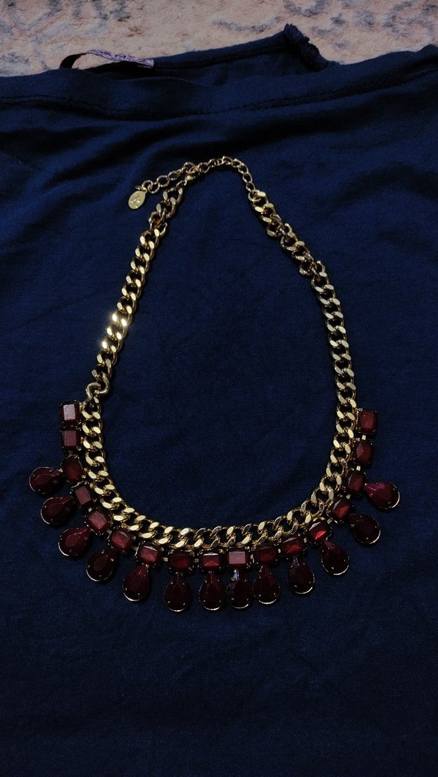Bohem tarzda, bordo desenli taşlarla süslenmiş zincir detaylı kadın kolyesi. Normal midi uzunlukta, romantik akşamlar için uygun, göz alıcı ve retro görünümlü.
