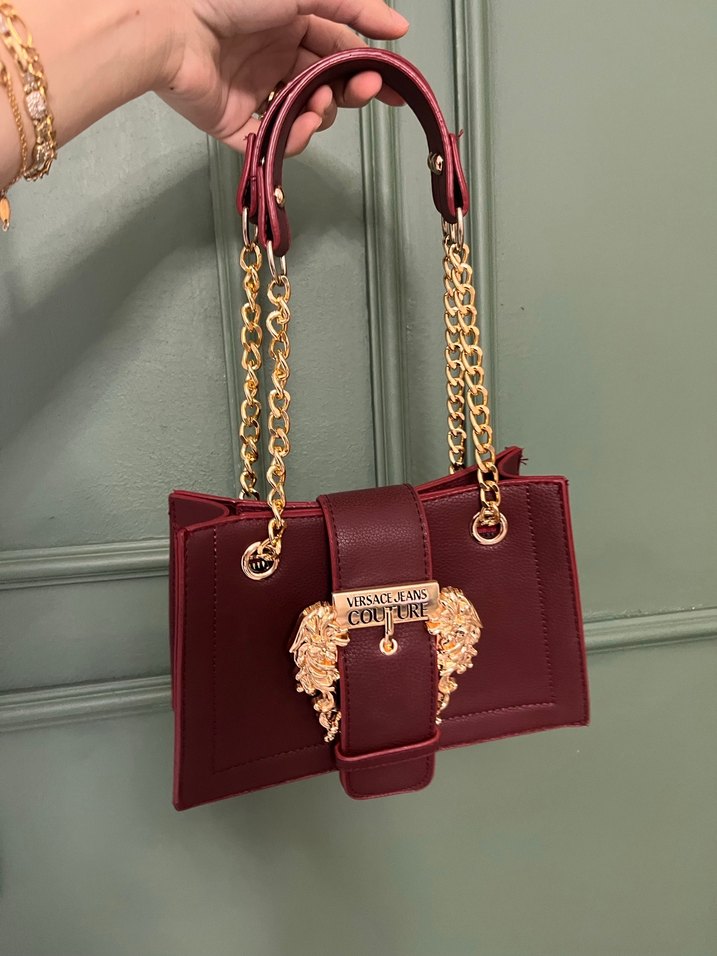 Bordo deri çanta, parlak altın zincir detayları ve baskılı armasıyla modern klasik Paris tarzını yansıtıyor.