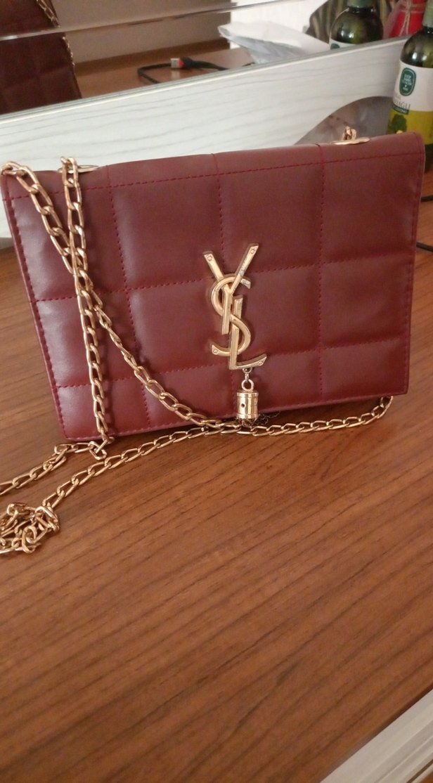 Bordo renkli, zincir detaylı deri kadın çanta. Parlak yüzeye sahip, baskılı desenli ve cesur Paris sokak stilini yansıtıyor.