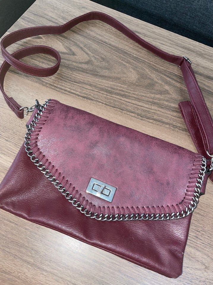 Bordo renkli, parlak deri kadın çantası, zincir detaylarıyla bohem Paris tarzını yansıtır, günlük kullanım için uygundur.