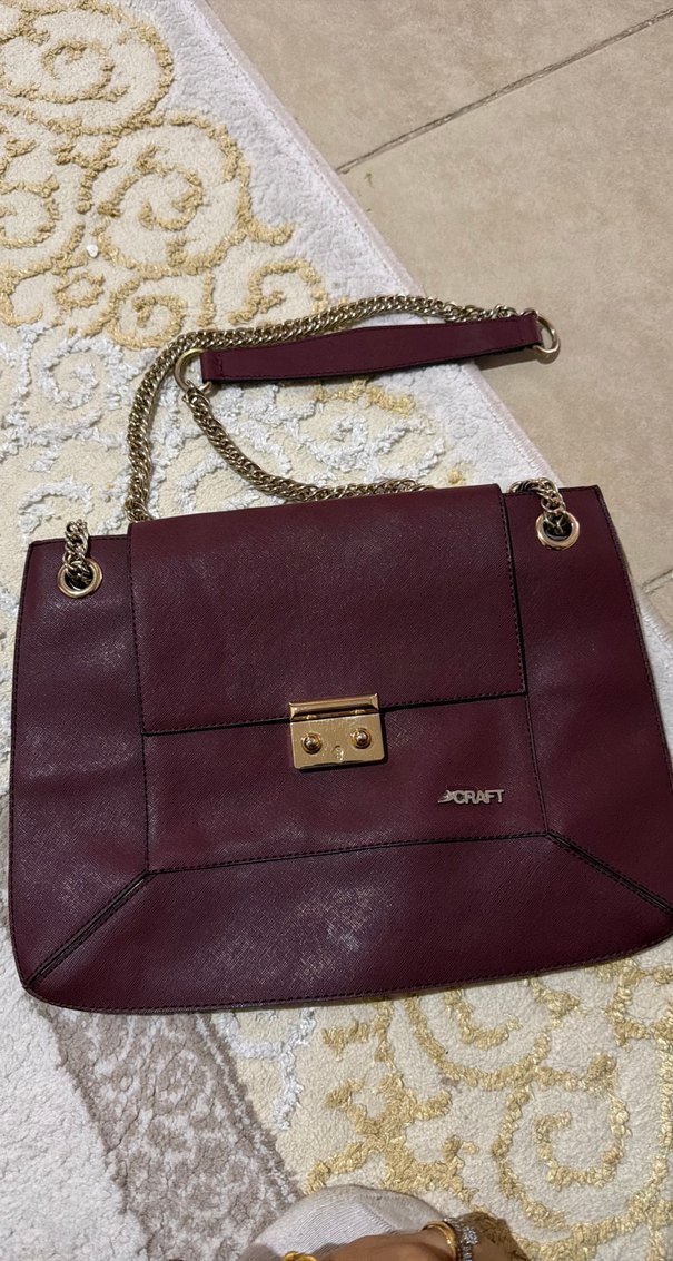 Bordo renkli deri çanta, parlak yüzey ve zincir detaylara sahiptir. Modern klasik tarza uygun, günlük kullanım için idealdir. Üzerinde 'CRAF' markası bulunur.