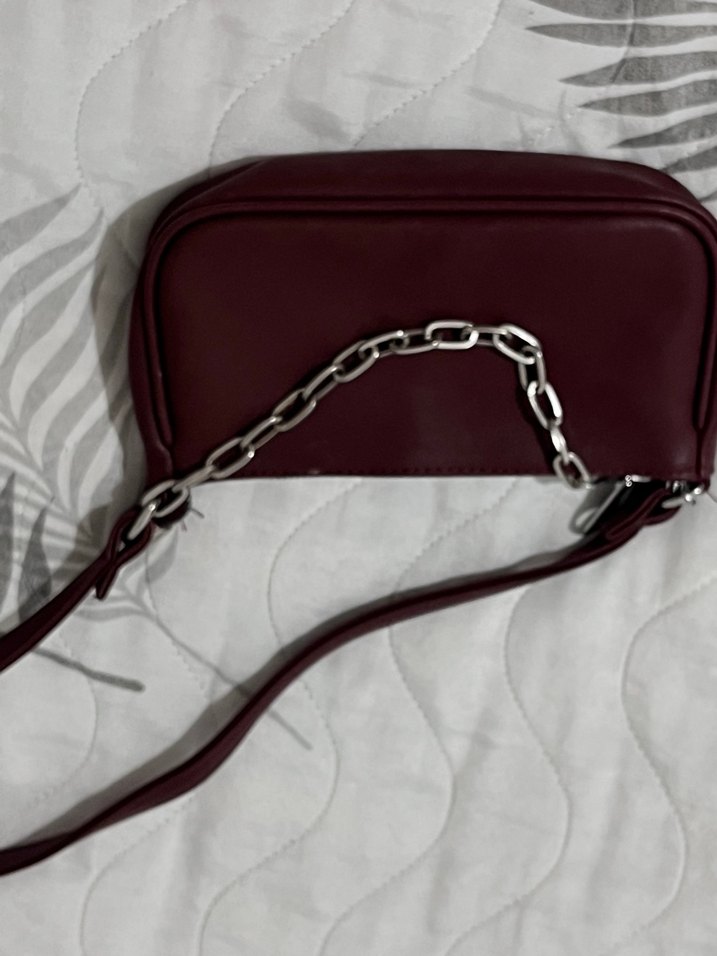 Bordo renkte deri ve zincir detayına sahip kadın çantası az kullanıldı defosuz