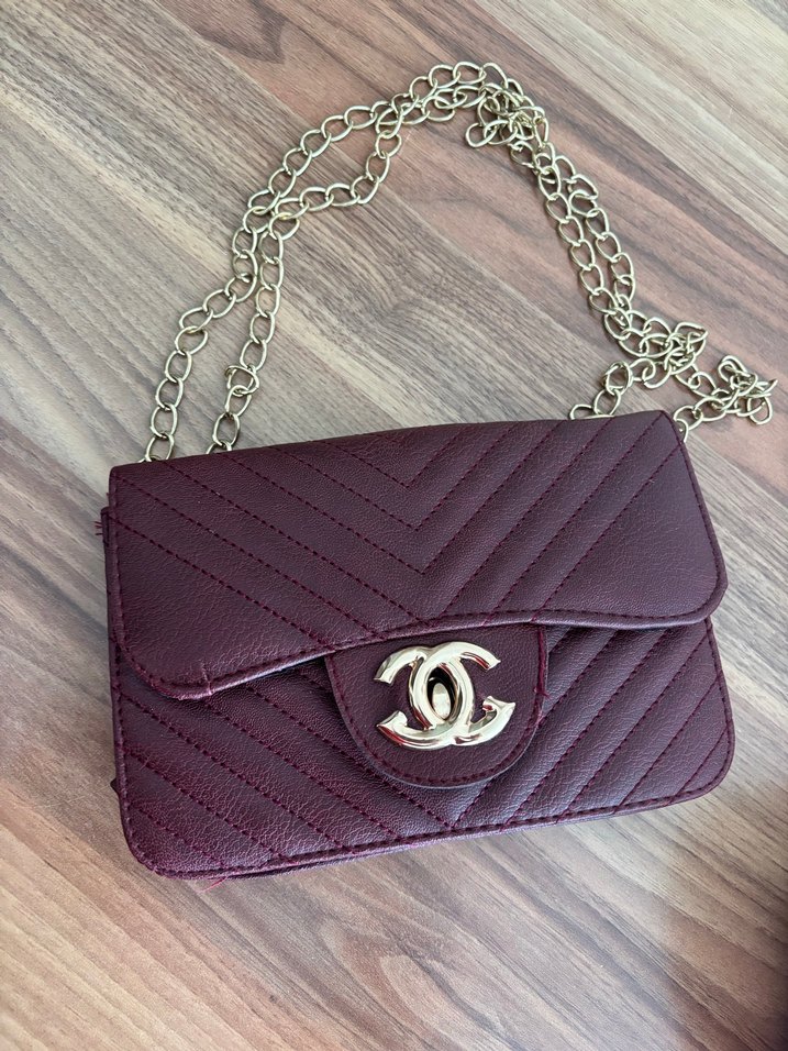 Bordo renkli deri çanta, parlak yüzey ve zincir detaylarıyla modern klasik tarzı Paris havasıyla buluşturuyor. Günlük kullanıma uygun, trend bir seçim.