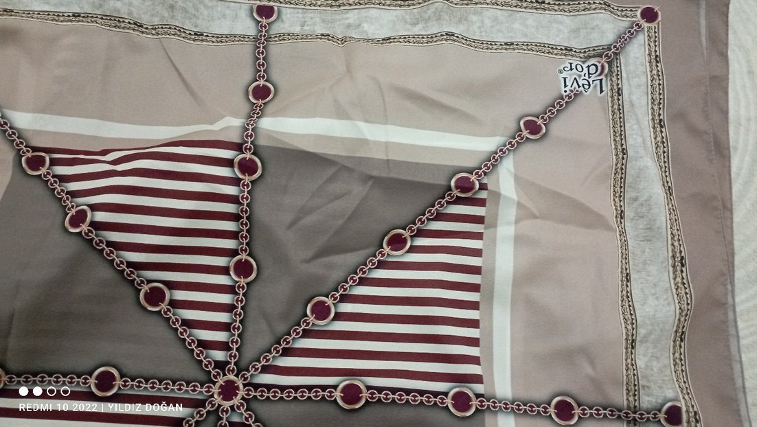 Bordo ve gri çizgili, zincir detaylı kadın fular. Yumuşak sentetik kumaştan, çağdaş ve bohem tarzı bir araya getirir.