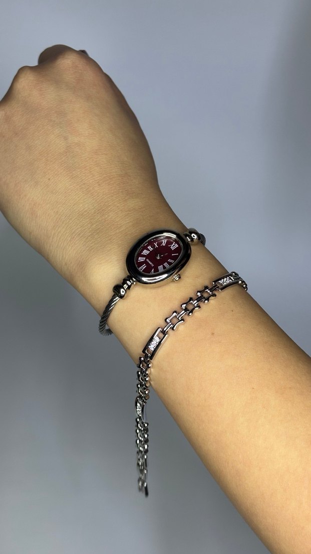 Bordo kadranlı, Roma rakamlı, zincir detaylı bilek saati. Minimalist ve gotik tarzda klasik şıklık sunar. ⌚saatin tek başına fiyatıdır