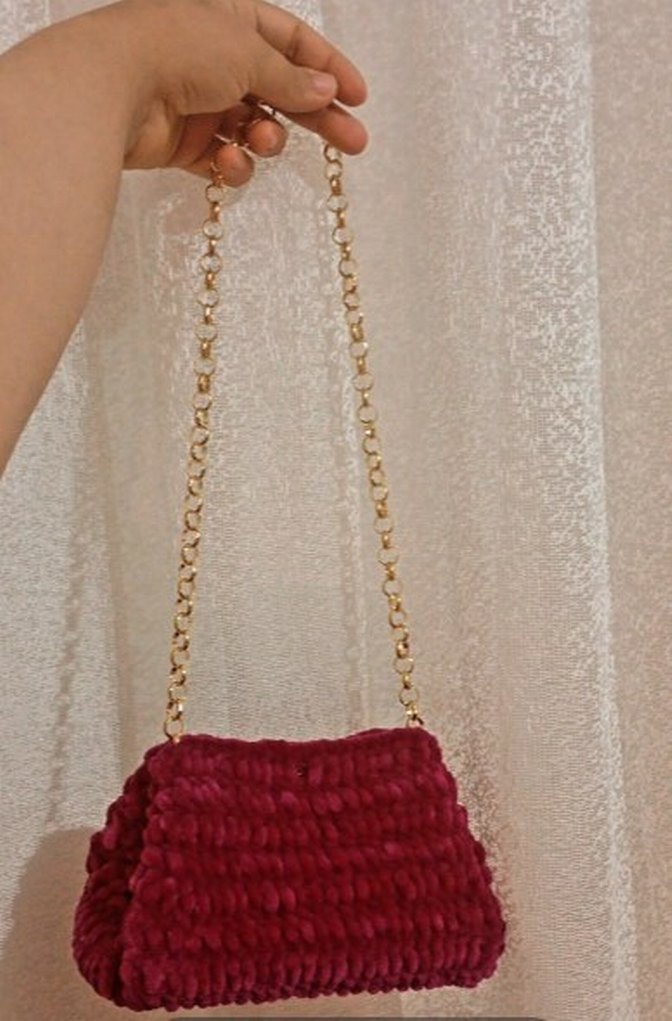 Bordo renkli, parlak dokulu örgü kadın çanta, zincir detaylarıyla bohem tarzı yansıtır, günlük kullanıma uygundur.