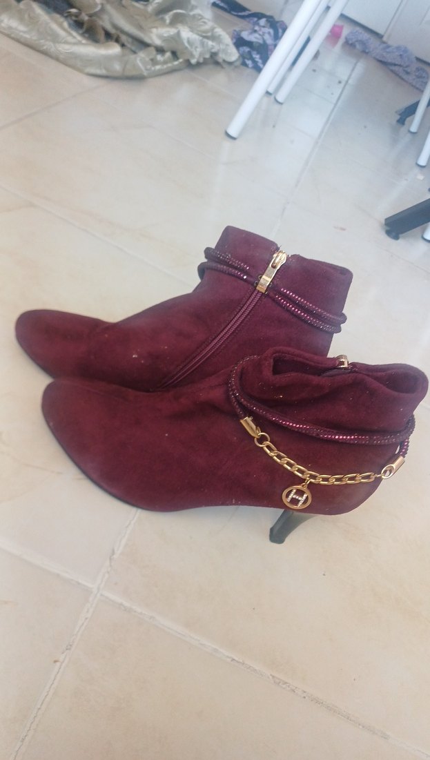 Bordo süet malzemeden yapılmış, stiletto topuklu, zincir detaylı rahat ve çağdaş tarzda günlük botlar.
