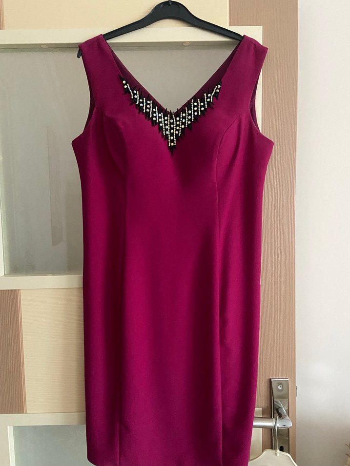 Bordo renkli, zincir detaylı V yakalı, kolsuz ve midi boy klasik kesim elbise. İşlemeli ve parlak dokusuyla romantik akşamlar için uygun.