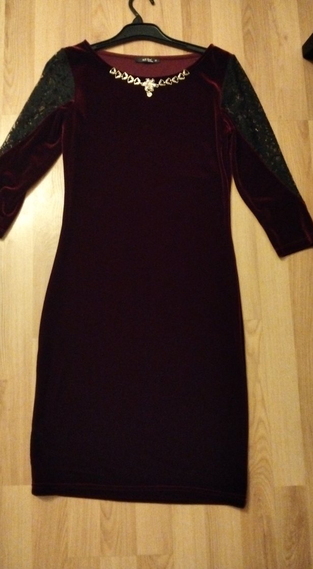 Bordo renkte, yarım kollu ve dantel detaylı bu midi elbise, ince kadifeve zincir detaylıdır. Romantik akşamlar için uygundur.