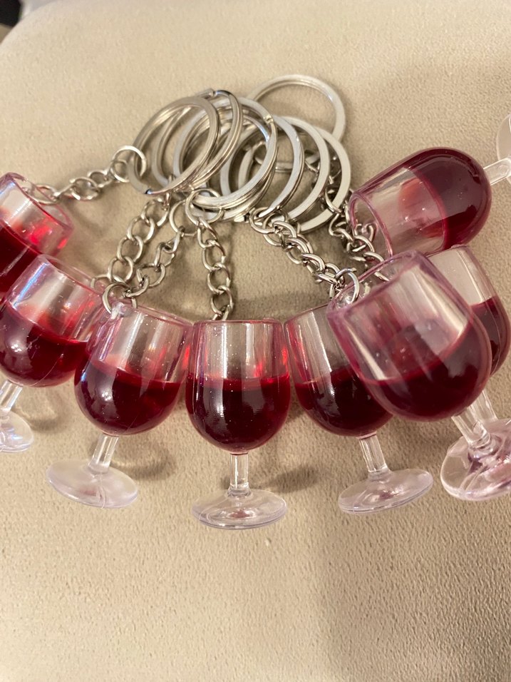 Parlak bordo mini şarap kadehleri zincir detaylı kadın anahtarlık, rahat ve karşı kültür tarzını yansıtıyor.