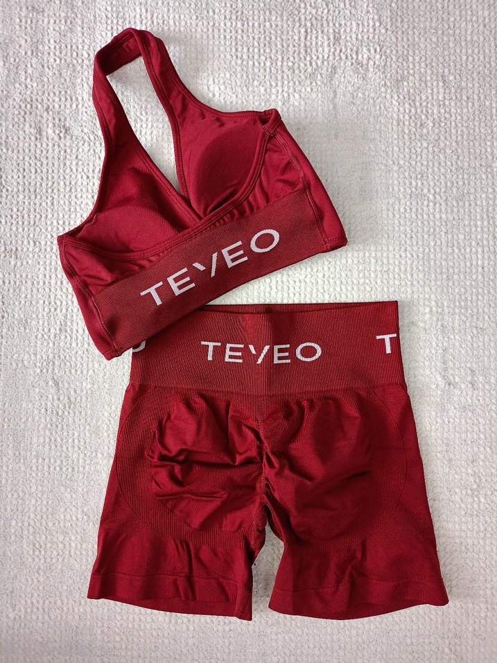 Koyu tie-dye desenli, kırmızı mini spor tayt ve spor sütyeni seti. Velcro detaylı ve TEYEO markalı, vücuda oturan kesime sahip. ️♀️