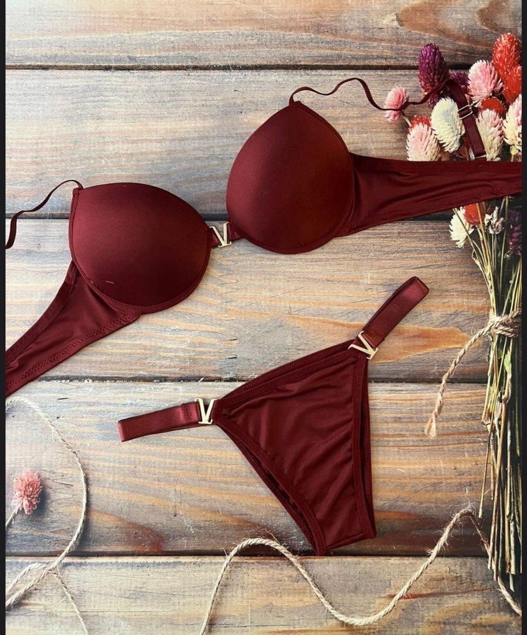 Bordo renkli, V model, minimal ve bohem tarzda, desen içermeyen, normal uzunlukta sütyen ve külot takımı.bedenler mevcuttur