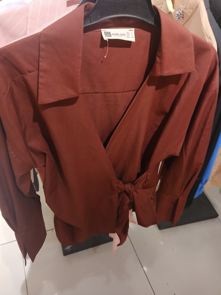 bordu uzun kollu, V yakalı ve kemerli midi uzunlukta kadın gömleği. Sentetik kumaştan, rahat ve salaş kesimli, günlük sokak stili için uygundur.