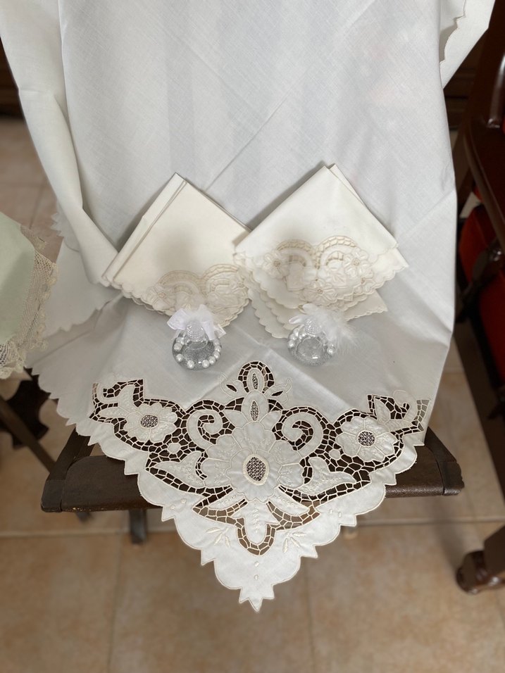 Boride el işlemesi güzel keten kumaşı ile altı adet peçete ve büyük örtü.çok amaçlı kullanılabilir.Borideler birer köşededir.