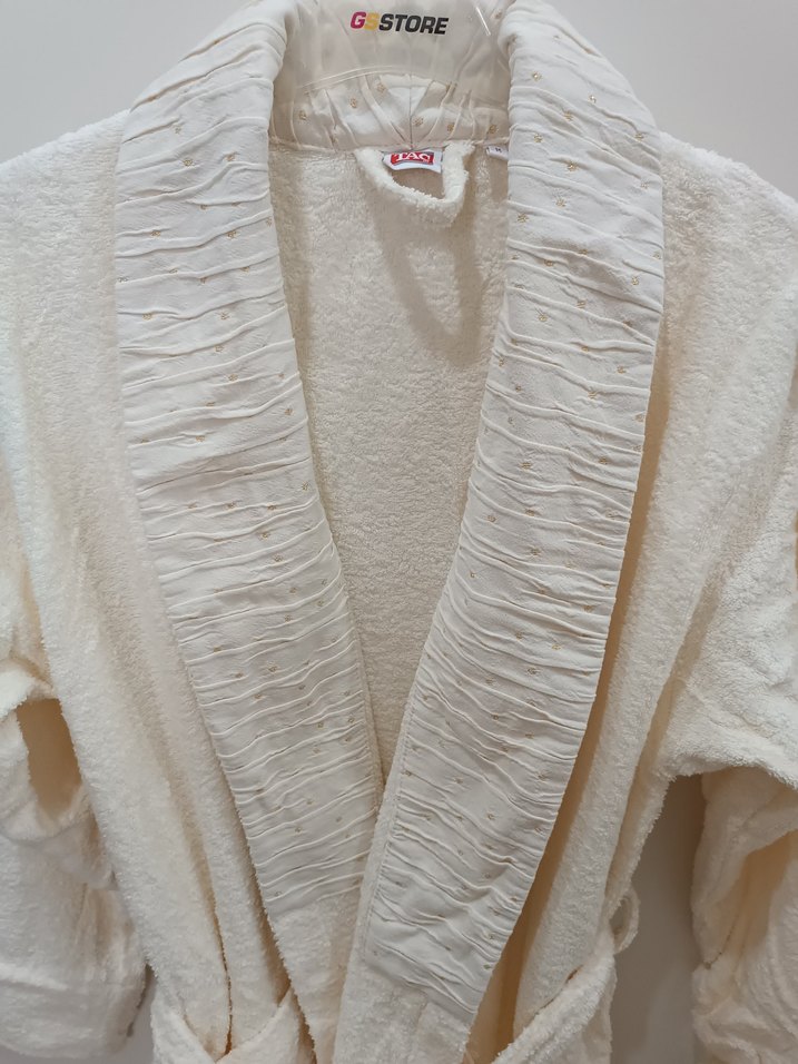 Taç marka bornoz hiç kullanılmadı kutusu mevcuut değil kadın bornoz boyu 107 kol boyu 53 bende M erkek bornoz boyu 115 kol boyu 57 beden L