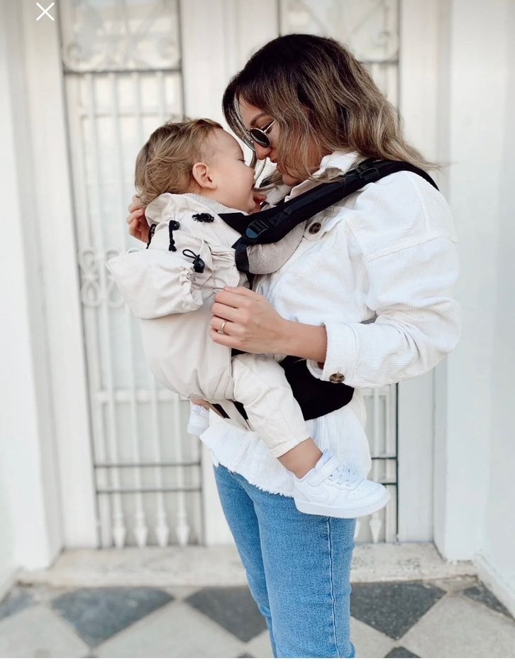Bej renginde, bebeğinizi rahat ve güvenli taşımanızı sağlayan ayarlanabilir kayışlı bebek taşıyıcı.
