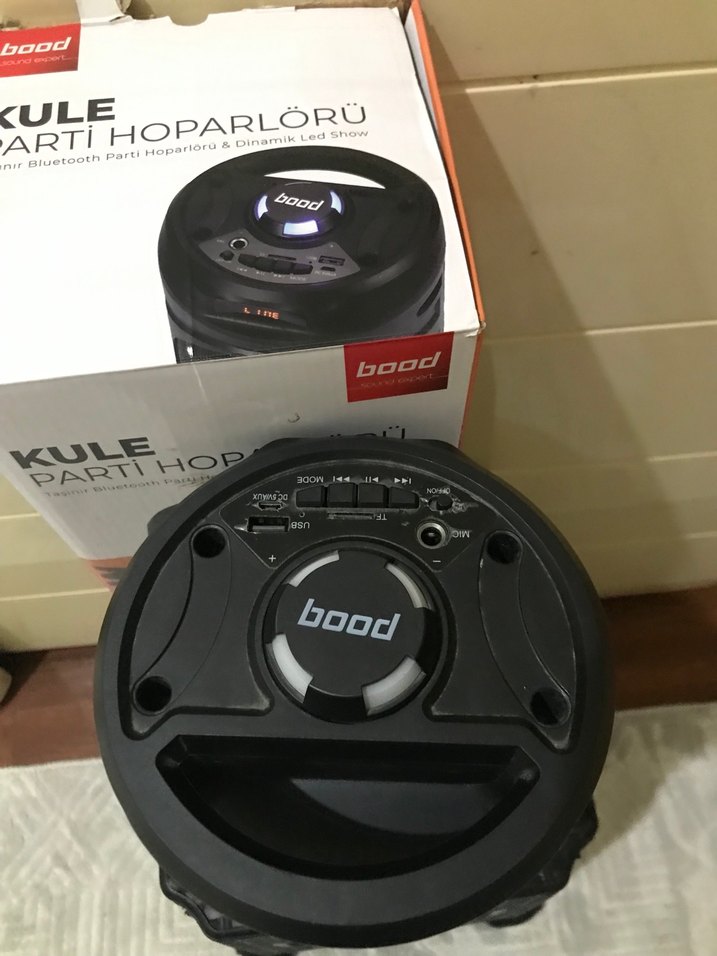 Siyah renkte Bluetooth özellikli parti hoparlörü, dinamik LED ışıklar ve çoklu kontrol düğmelerine sahiptir. Yüksek ses kalitesi ve kolay bağlantı sağlar. ürün yeni dir