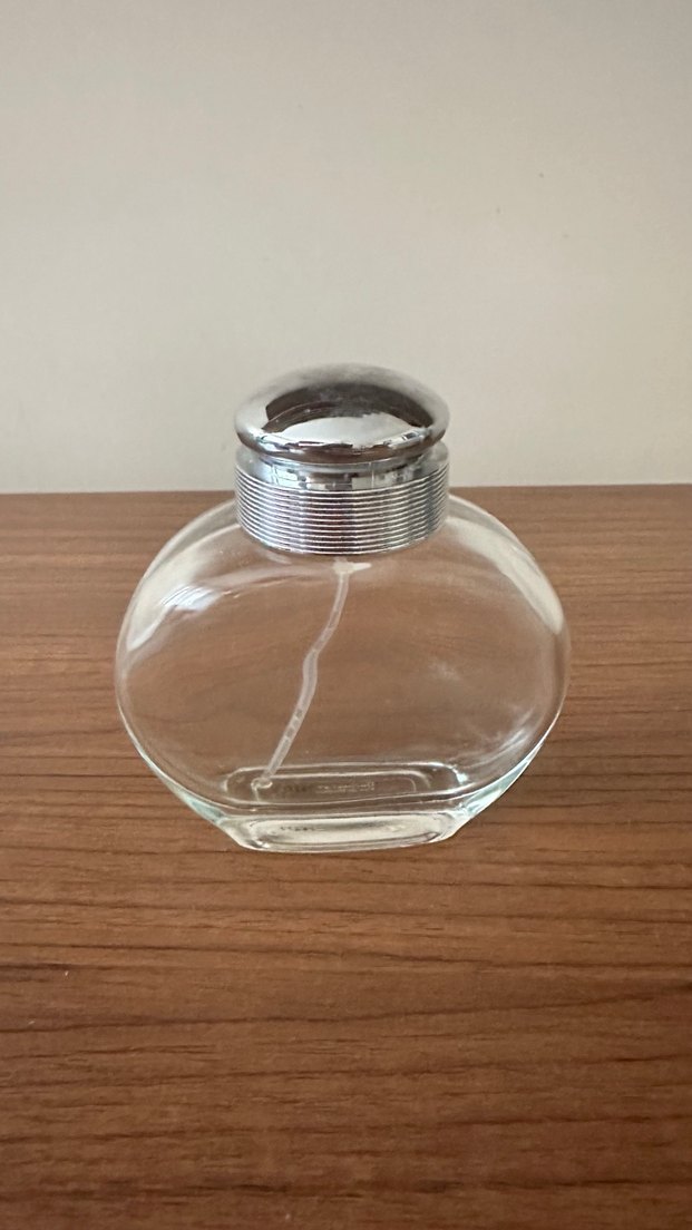 Gümüş kapaklı, şeffaf camdan yapılmış kadın parfüm şişesi, sade ve şık tasarıma sahip.