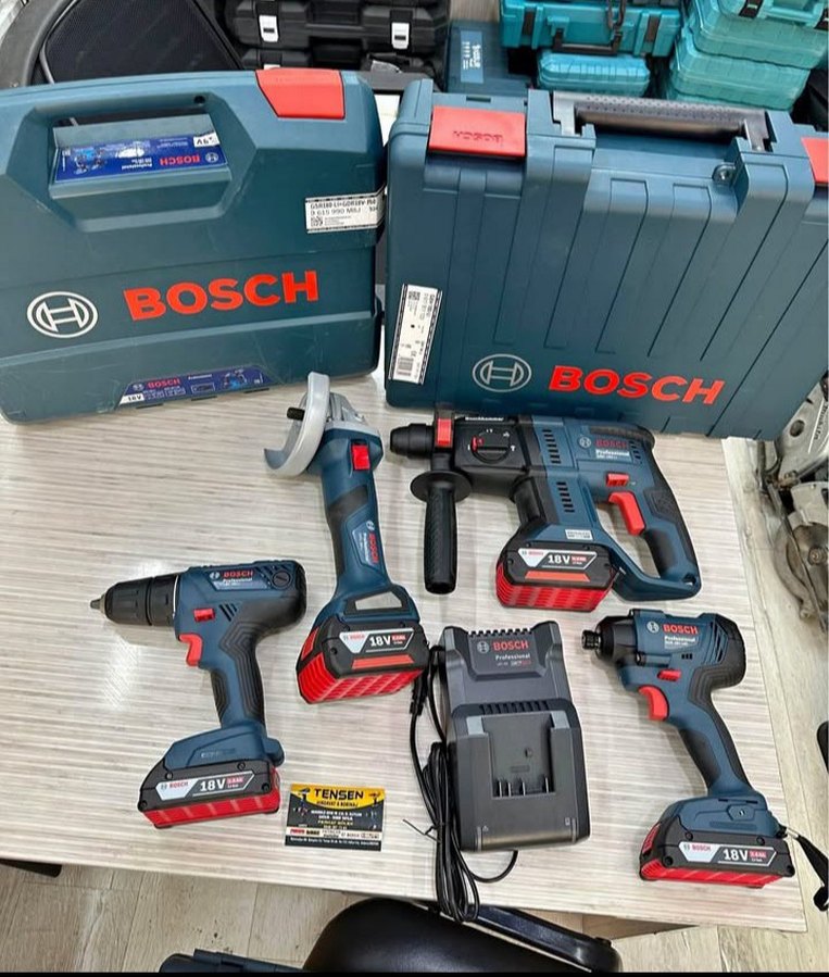 Bosc 4 lu set 4 lu makine 4 akü 1 şarj cihazi garantili ürünlerdir.Bosch 18V kablosuz matkap seti koyu mavi renk, çoklu matkaplar, bataryalar, şarj cihazı ve taşıma çantaları içerir.