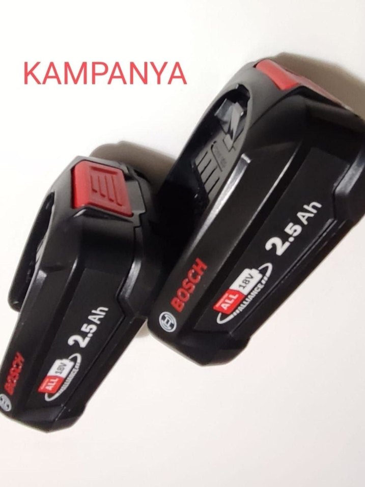 Bosch markalı, 2.5 Ah kapasiteli, siyah renkte iki adet batarya seti.