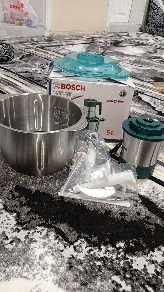 Bosch çok fonksiyonlu mutfak robotu, 5 litrelik paslanmaz çelik hazne ve çeşitli aparatlarla birlikte gelir. Turkuaz kapak ve gri motor ünitesi bulunur.