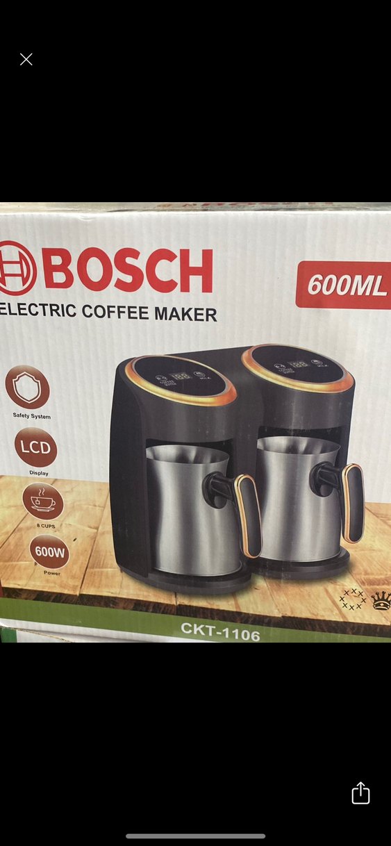 Bosch elektrikli kahve makinesi 600ml kapasite, 600W güç ve LCD ekran sunar. Güvenlik sistemi ve iki paslanmaz çelik bardak içerir. ☕
