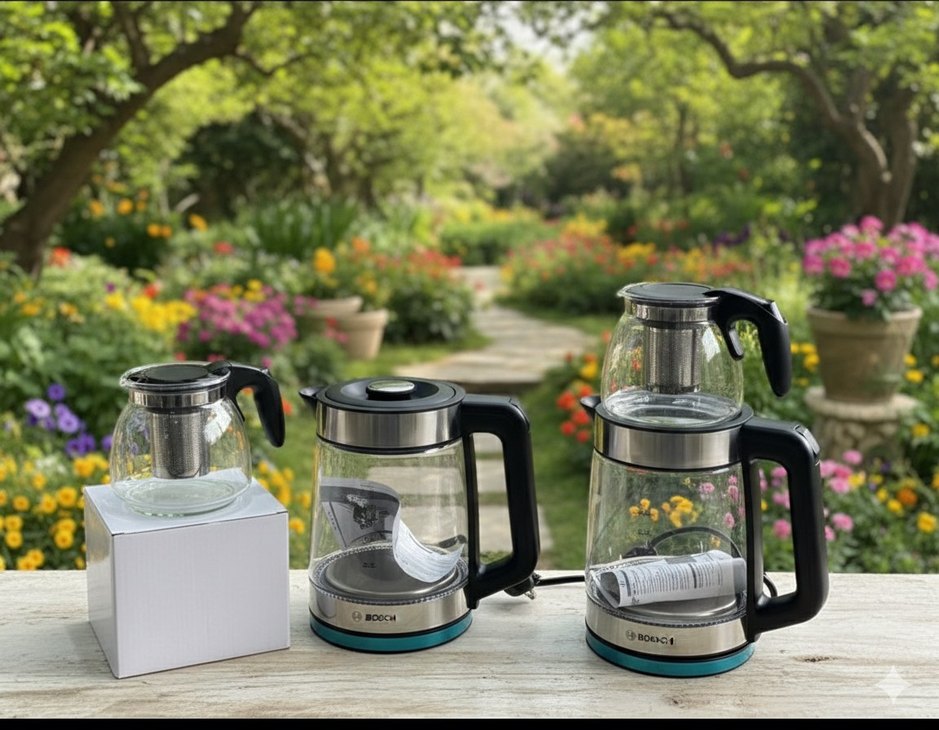 Bosch'un siyah saplı, cam gövdeli ve paslanmaz çelik tabanlı beyaz gri çay makinesi, şık ve kullanışlıdır.