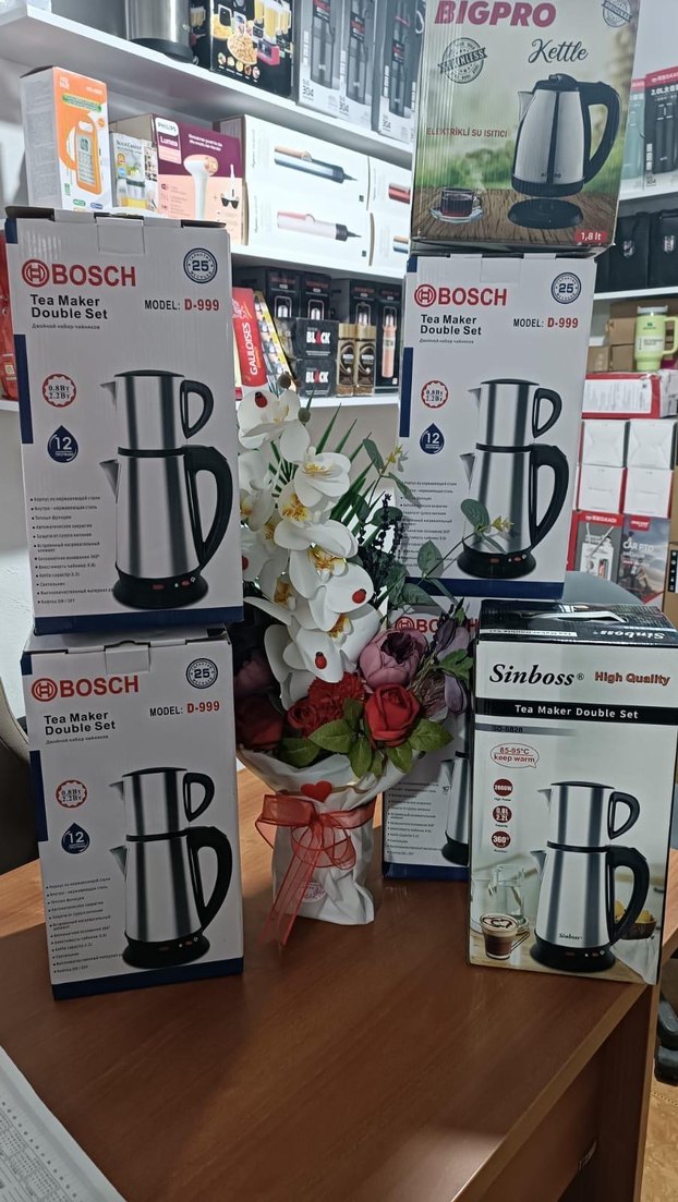 BOSCH D-999 model çift demlikli çay makinesi, 12 fincan kapasite ve 25 dakikalık zamanlayıcı ile