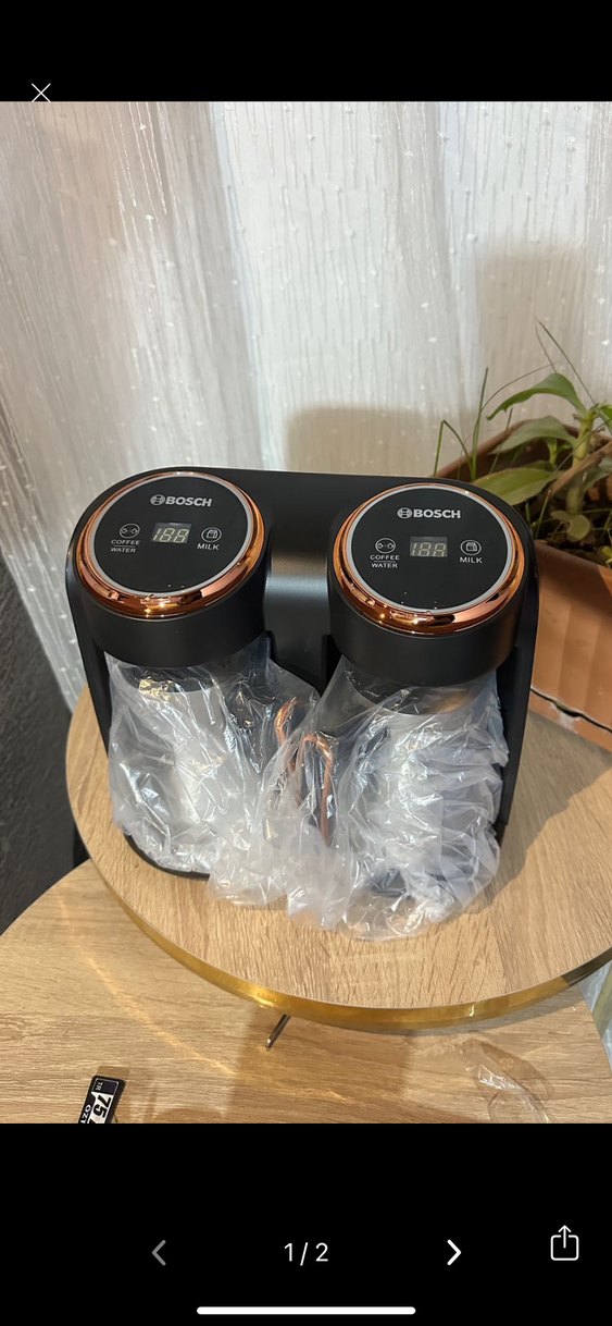 Bosch kahve makinesi, koyu kahverengi tasarıma sahip ve iki ayrı demleme ünitesi içerir. Kahve ve süt ayarları için dijital ekranlar ve kontroller bulunur. ☕