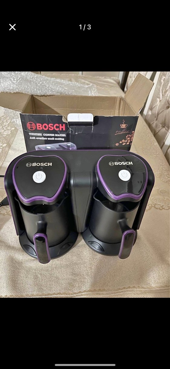 Bosch kahve makinesi, çiftli ve koyu mor renkte olup, her biri tek tuşla çalışan pratik bir tasarıma sahiptir. Kompakt ve kullanışlıdır. ☕