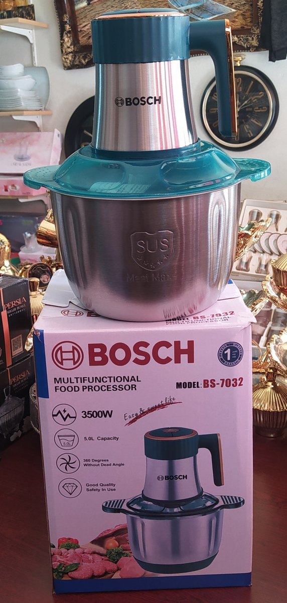 Bosch çok fonksiyonlu mutfak robotu, 3500W gücünde ve 5.0L paslanmaz çelik hazne kapasitesine sahiptir. 360 derece açıyla çalışır ve güvenlidir. Model BS-7032, turkuaz renklidir.
