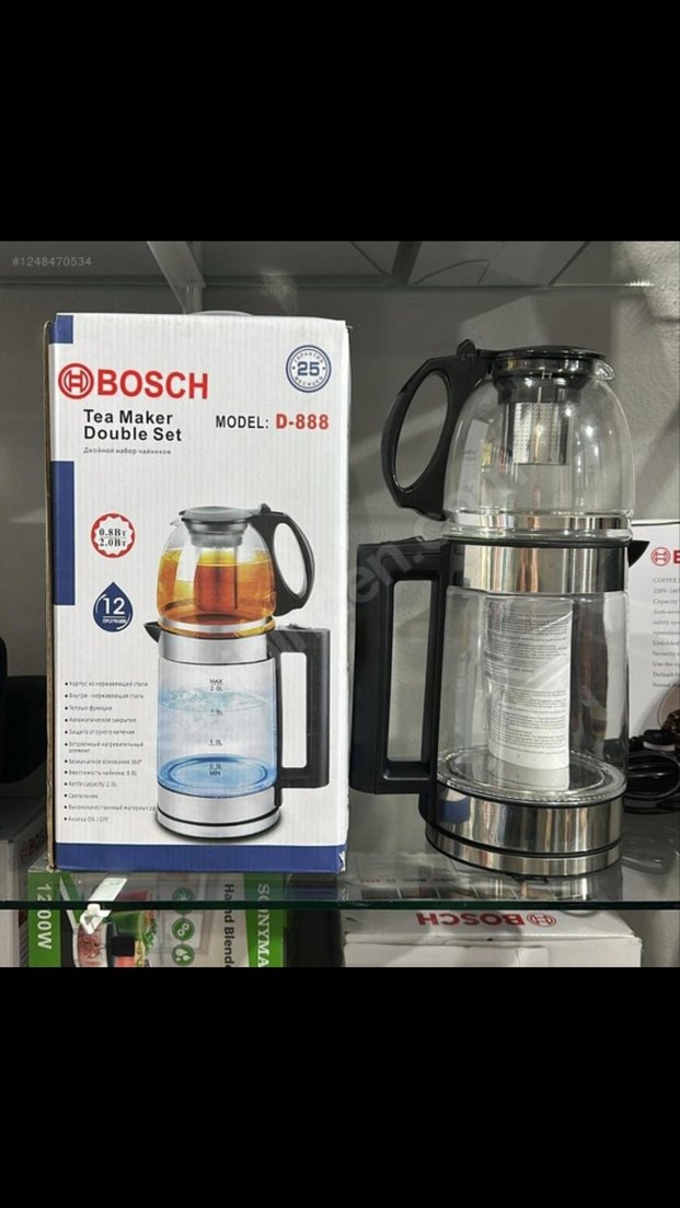 Bosch markalı D-888 model demlikli çay makinesi, cam gövde ve gri-beyaz detaylarla tasarlanmıştır. Pratik kullanım için üstte küçük bir demlik bulunur. ☕
