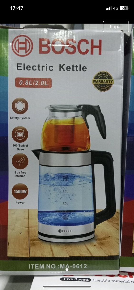 Bosch elektrikli çay makinesi, güvenlik sistemi, BPA içermeyen iç yüzey, 1500W güç ve 360° döner taban özelliklerine sahiptir. 0.8L demlik ve 2.0L su ısıtıcısı kapasitelidir.