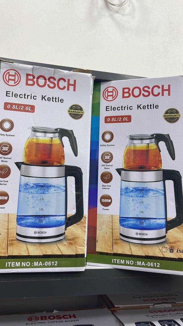 Bosch elektrikli su ısıtıcısı 0.8L cam demlik ve 2.0L su ısıtıcısına sahiptir. 360° dönebilen taban, 1500W güç ve BPA içermeyen iç yüzey bulunur. ☕