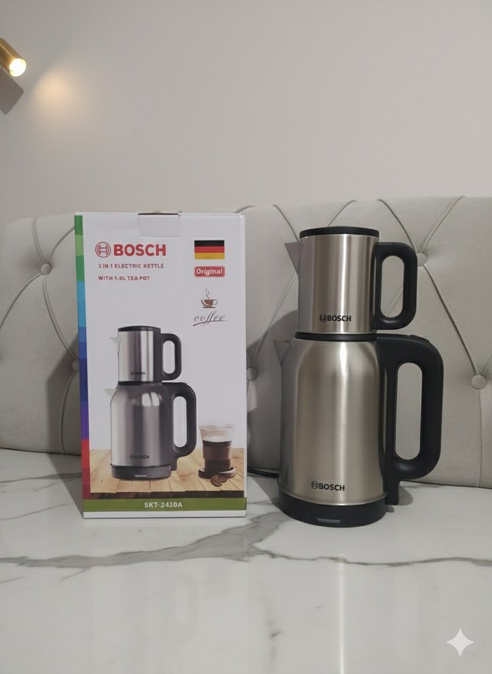 Bosch gri elektrikli çay makinesi, paslanmaz çelik tasarımıyla su ısıtıcı ve demliği bir arada sunar. Pratik kullanım sağlar.
