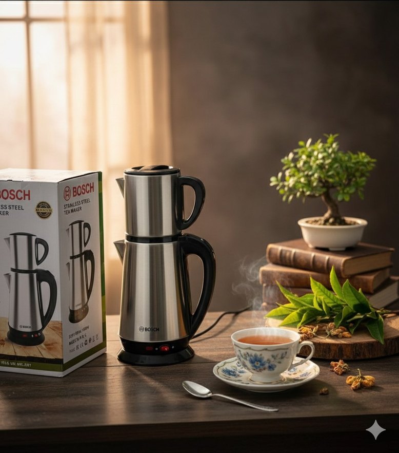 Bosch çay makinesi, gri paslanmaz çelik gövde ve siyah sapaya sahiptir. Su ısıtıcısı ve demlik olarak kullanılır, modern tasarımıyla çay demlemeyi kolaylaştırır. ☕