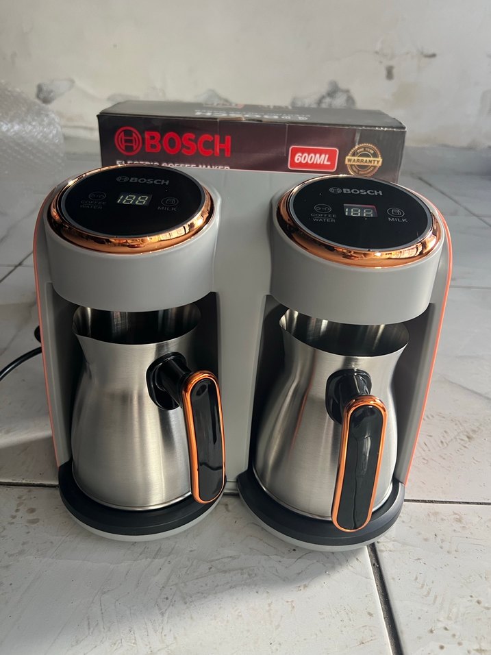 Bosch kahve makinesi paslanmaz çelik sürahisiyle gelir. Gri gövde ve turuncu detaylara sahip, üstte dijital ekran bulunur ürün sıfırdır kendi kutusunda gelir ☕