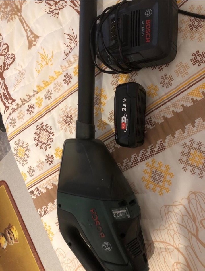 Bosch marka koyu yeşil kablosuz elektrikli süpürge, çıkarılabilir batarya ve şarj cihazı ile birlikte.
