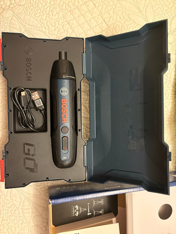 Bosch marka mini elektrikli tornavida seti, koyu mavi renkte, USB şarj kablosu ve sağlam taşıma kutusuyla birlikte.