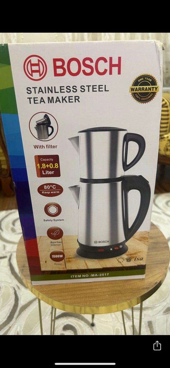 Bosch çay makinesi paslanmaz çelikten üretilmiştir ve filtre içerir. Toplam kapasitesi 1.8+0.8 litredir ve çayı 80°C'de sıcak tutar. Güvenlik sistemi ve BPA içermeyen iç yüzeye sahiptir, 1500W güçtedir. 1 yıl garantilidir.