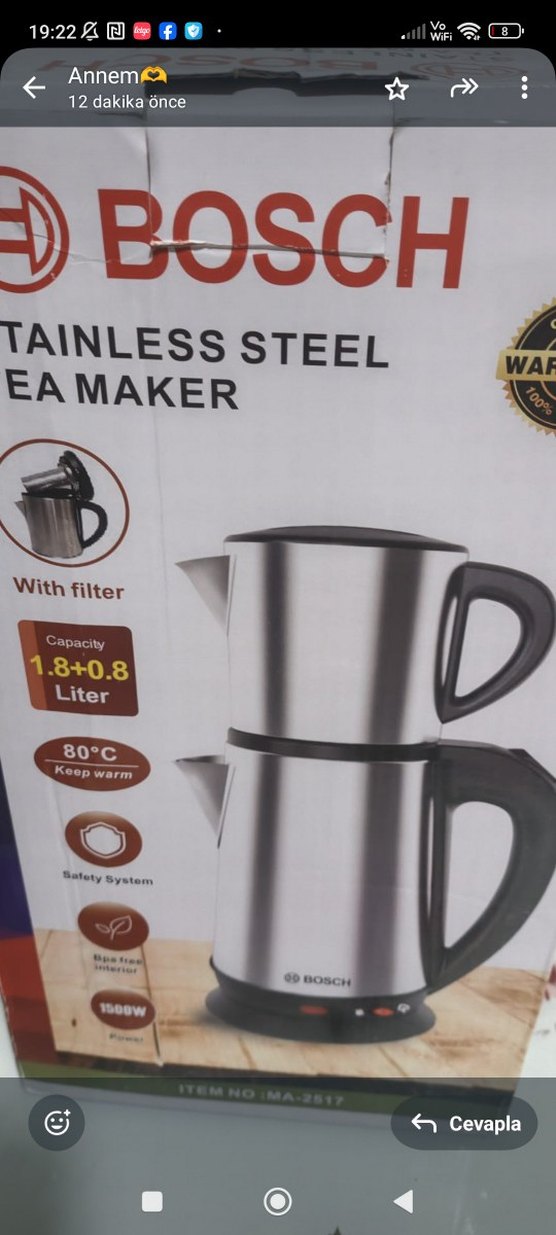 Bosch paslanmaz çelik çay makinesi 1.8+0.8 litre kapasiteye sahip, filtreli ve 80°C sıcaklıkta çayı sıcak tutar. Güvenlik sistemi mevcuttur. ☕