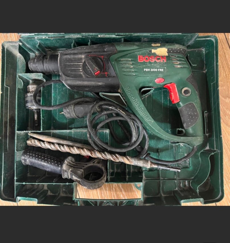 Bosch PBH 3000 FRE kırıcı delici matkap, yeşil gövde ve siyah detaylarla. Güç kablosu ve matkap uçları dahildir, ağır iş delme ve kırma işleri için uygundur. ⚙️